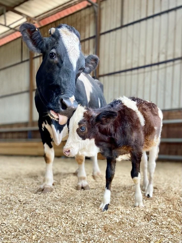 Ruthi the cow and Tamar the calf have become family on Freedom Farm in Israel. ‘Ruthi is a 13-year-old cow who was recently rescued from a dairy farm. She had 11 babies taken from her immediately after giving birth. She arrived at the farm after the dairy farmer decided to give her a good retirement after producing so much milk all these years. About two weeks [after arriving] we got a call about a day-old calf who was found alone, still with the umbilical cord attached. We brought her to the farm and named her Tamar. After checking that Tamar was healthy and didn’t have any contagious disease, we decided to let her get to know the rest of the cows. When Ruthi saw her, her eyes were so wide! She immediately fell in love with the new baby and started licking her and protecting her from the rest. She even let her nurse from her own milk (she still had some left). Ruthi basically adopted Tamar, and now they sleep together, eat together and spend the whole day with each other.’