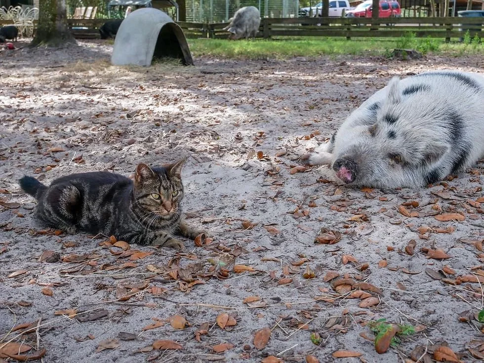The cats and pigs at Rooterville in Florida, USA, are BFF’s and ‘finding a cat with pigs is typical. In the winter, the cats will sleep on the pigs to stay warm. They love each other. The pigs go into a trance almost when they get near a cat, hoping they'll get a cat massage. Cat toenails on pig skin is heavenly to the pigs.’